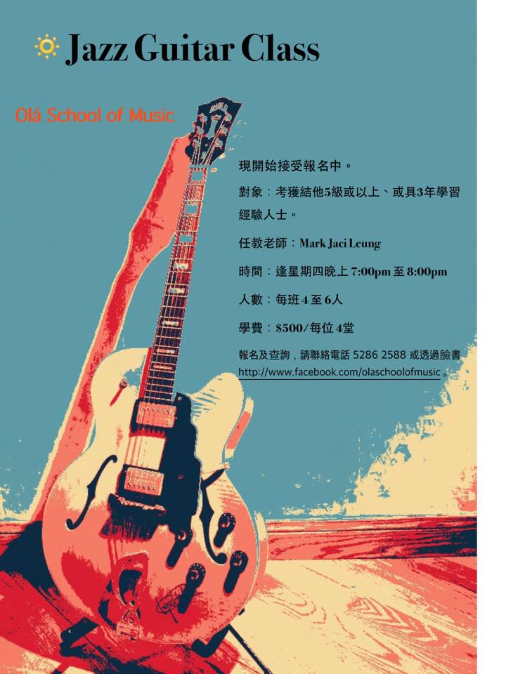 爵士結他(Jazz Guitar) 以現有爵士標準曲(Jazz Standard),爵士藍調(Jazz Blues)及爵士樂曲(Jazz Tune)等為教學藍本,教授其主旋律、和弦、伴奏方法及爵士樂的基本即興法則及運舌(articulation);配以聽默、分析及演奏經典爵士樂手(例如Chet Baker、Dexter Gordon、Jim Hall 、Mile Davis etc.)的即興段落,讓學員真實地認識爵士樂的美麗;於樂曲學習之間,教授曲目所需之音階、琶音、連奏技巧及和弦。