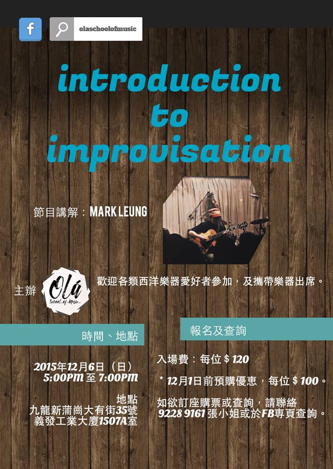 12月6號 再來 Mark Leung主持既音樂座談,題目仍然係 Introduction To Improvisation。上次miss左既朋友,今次可以再參加啦。