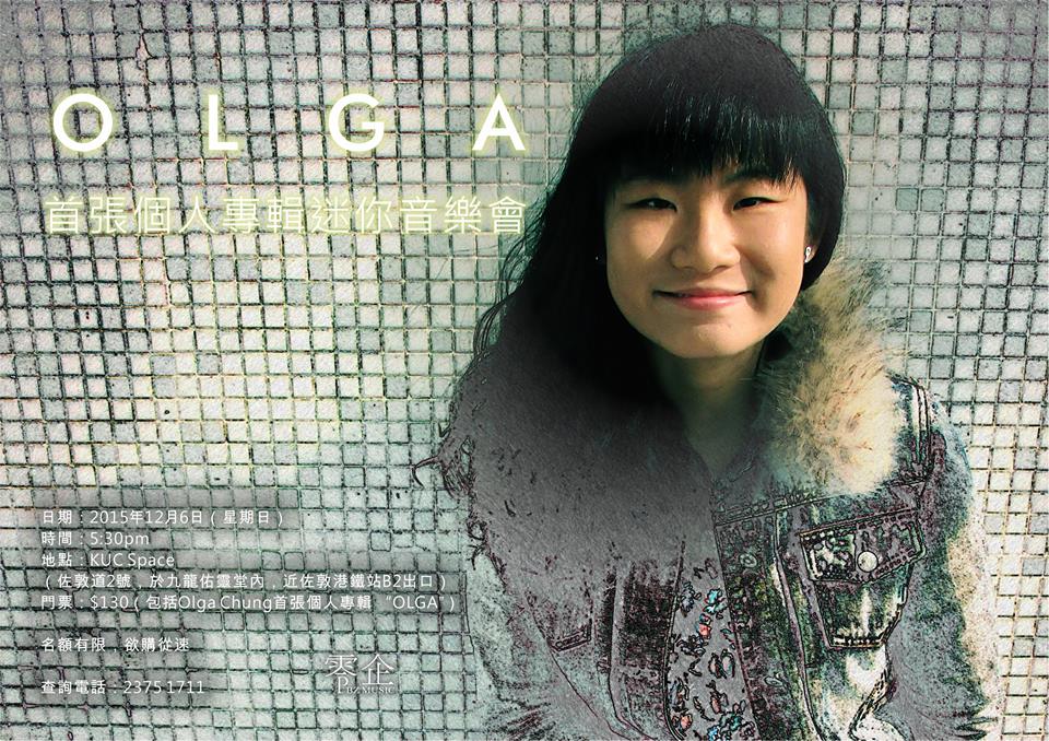 而"OLGA"專輯發佈mini concert亦將於12月6日(星期日)5:30pm於佐敦KUC Space舉行。現誠邀各位不論聽過或未聽過Olga歌聲的朋友購票支持這位真心音樂人步行每寸音樂之路(門票已包括"OLGA"專輯一張)。謝謝!」
