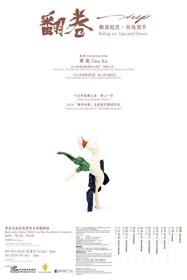 Sweep, a brand new 2016 milestone in Chen Kai's Classifiable Movement series focusing on rolling movement. Body movements and stage designs are kept nearest to the level of the ground, a very fresh visual angle for you to feast the contemporary dance performance.