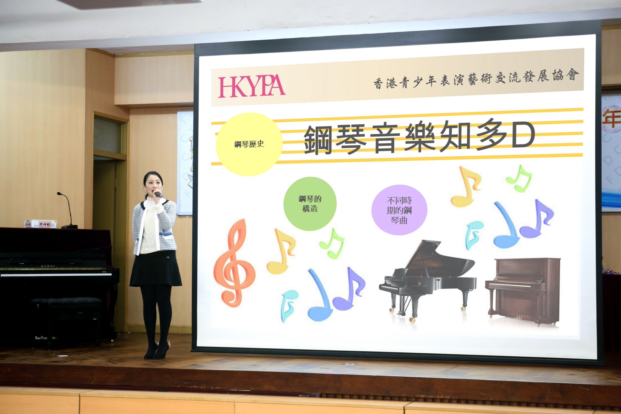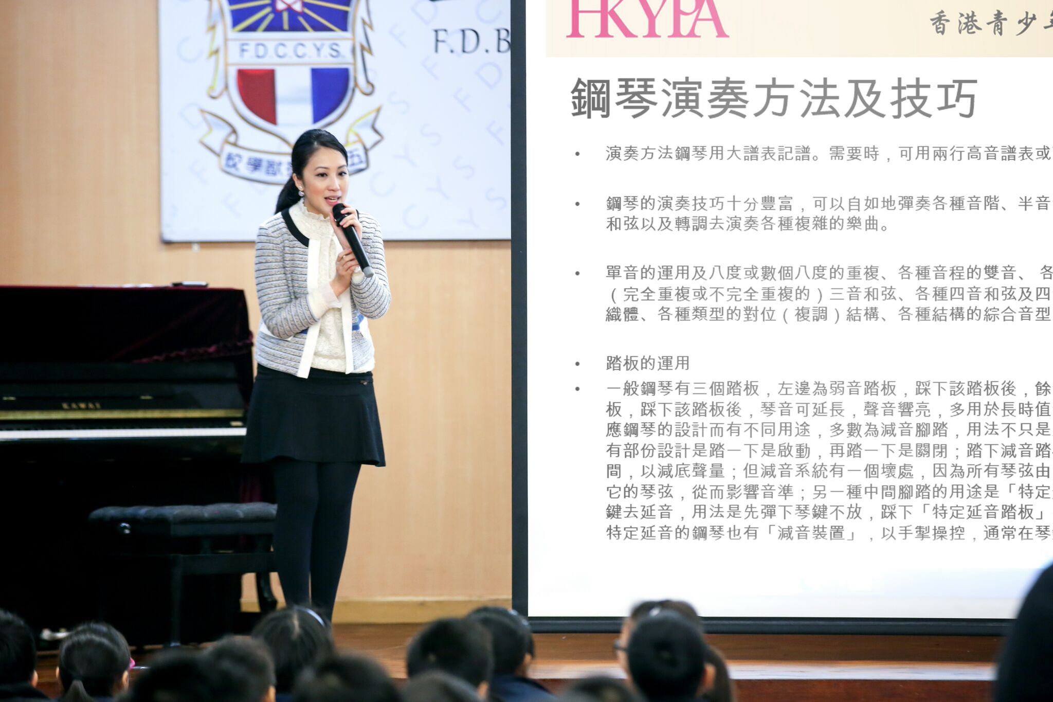 由協會主席李穎琴女士分享鋼琴歷史 、構造和不同時期的鋼琴音樂 ; 適逢香港學校音樂節快將舉行 , 李主席更即場作鋼琴大師課指導學生。