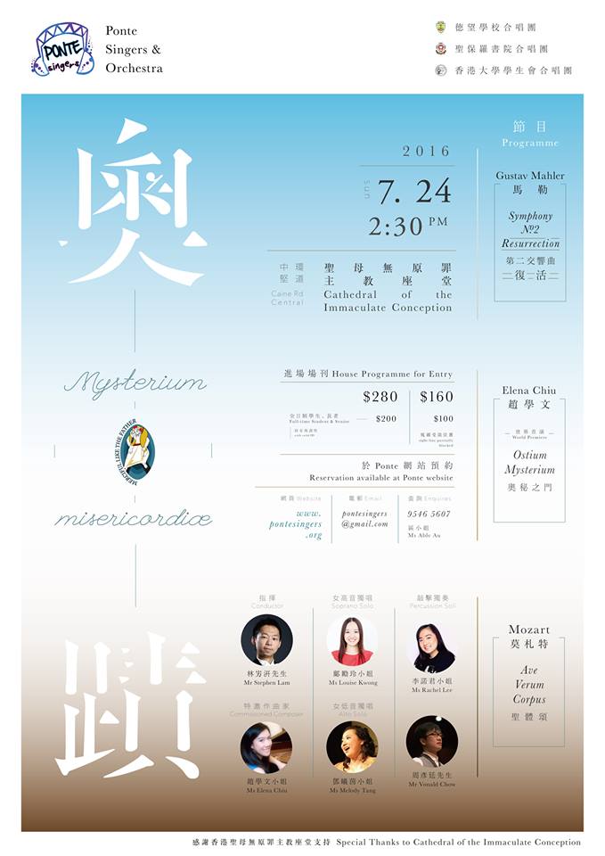 Ponte Singers & Orchestra今年蒙天主教主教座堂支持,於2016年7月23日於澳門玫瑰堂,及2016年7月24日於香港,舉行「奧.蹟」音樂會,今次是這間古典的教堂首次舉辦如此大型的音樂會,適逢今年為天主教特別慈悲禧年,Ponte將聖經的幾件奧蹟,以音樂表達出來。音樂會將會聯同200多名樂手,包括德望學校合唱團、聖保羅書院合唱團及香港大學學生會合唱團聯合演出,陣容及水準皆是香港少見的。