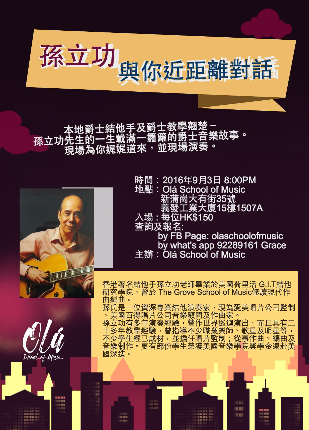 香港著名結他手孫立功老師畢業於美國荷里活 G.I.T結他研究學院,曾於 The Grove School of Music修讀現代作曲編曲。