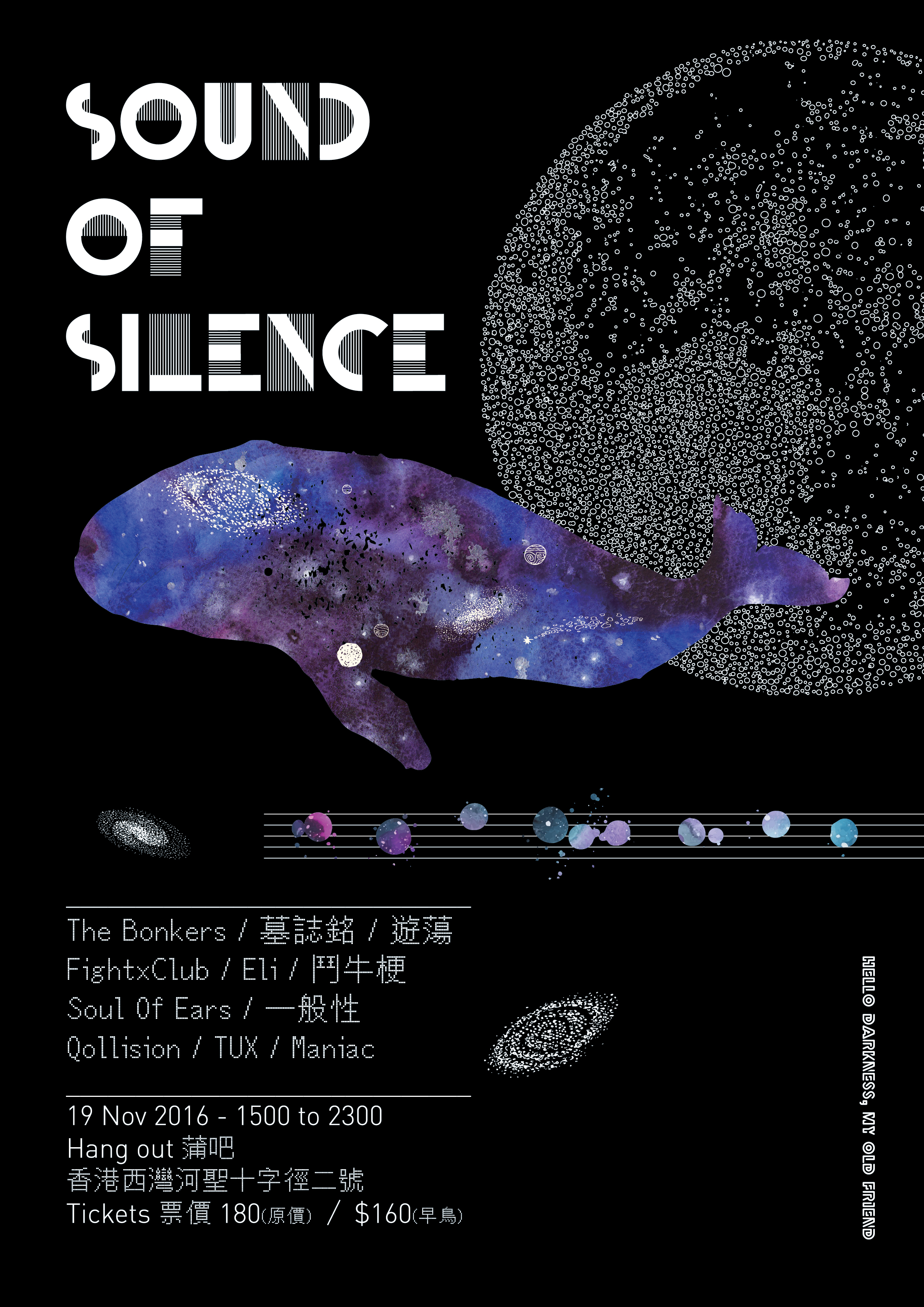 為大家帶黎十一隊本地樂隊去同你分享佢地既Sound of Silence。好多隊好耐無見既老朋友,可以一日睇哂。《 Sound of Silence》想帶大家去感受每一隊樂隊佢地最心底內既聲音。 今次絕對係不可錯過既一場全日show。