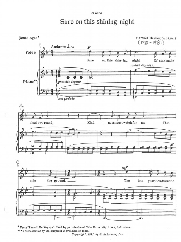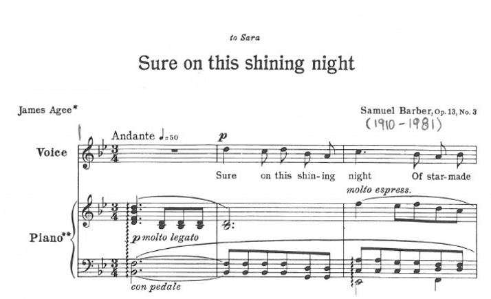 再看看鋼琴部分,不難發現除了連綿不斷的block chords之外,還有自己的旋律。這個旋律好像永遠不會與人聲一同開始,樂曲開始時是人先過琴,然後再出現sure on this shining night這一句時則是琴先過人,兩條旋律像在輪唱但又不完全一樣,兩者永遠孤獨地追逐(wand’ring far alone)。更令人歎為觀止的是原來人聲與鋼琴的旋律在樂曲再重現歌名時互換了角色!再讀詩詞,開首是星光照耀下造出塵土上的影子(of starmade shadows),結尾是詩人驚嘆漫天星星,星體土地上所反照的光影(of shadows on the stars)。這一個主謂語對調,就促發Barber寫出了這一首人聲與鋼琴旋律前後互換的歌曲,所以大家應該能察覺到,在藝術歌曲中,鋼琴不是「伴」奏,而是協奏(collaborative piano)。