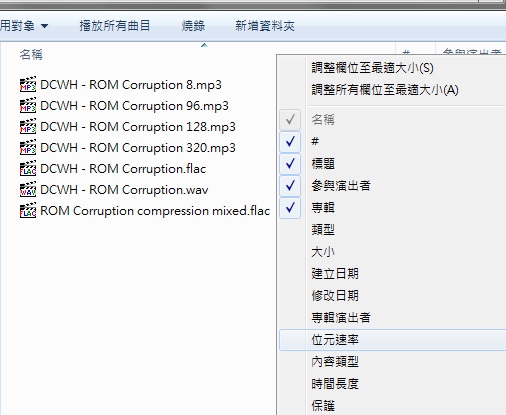 右鍵欄位(名稱/參與演出者/標題 的位置)-->位元速率