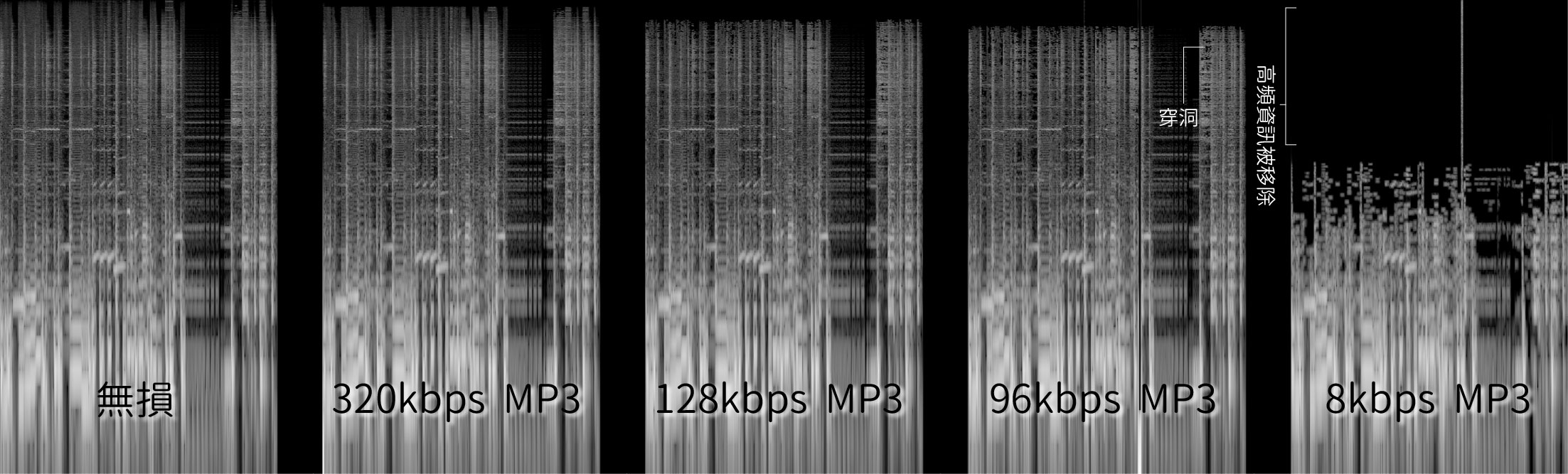 以下是無損、320kbps、128kbps、96kbps、8kbps MP3的比較。從頻譜圖中可以看到一條明顯的界線,kbps越低越多高頻的聲音消失掉。除了界線以上完全消失,界線以下也有聲音消失,好像穿了很多細小的洞。8kbps更加明顯,只剩下一點地方有聲。