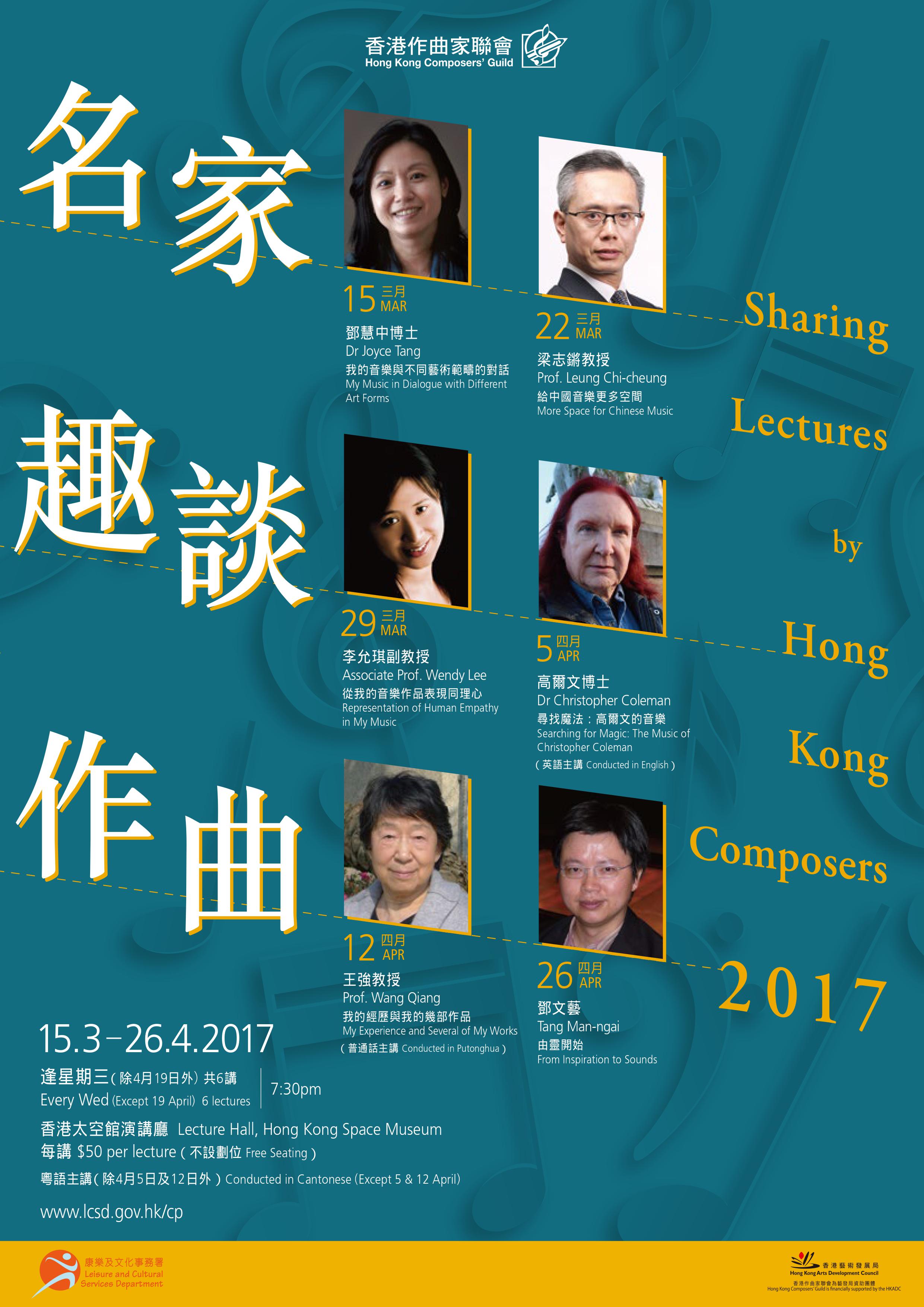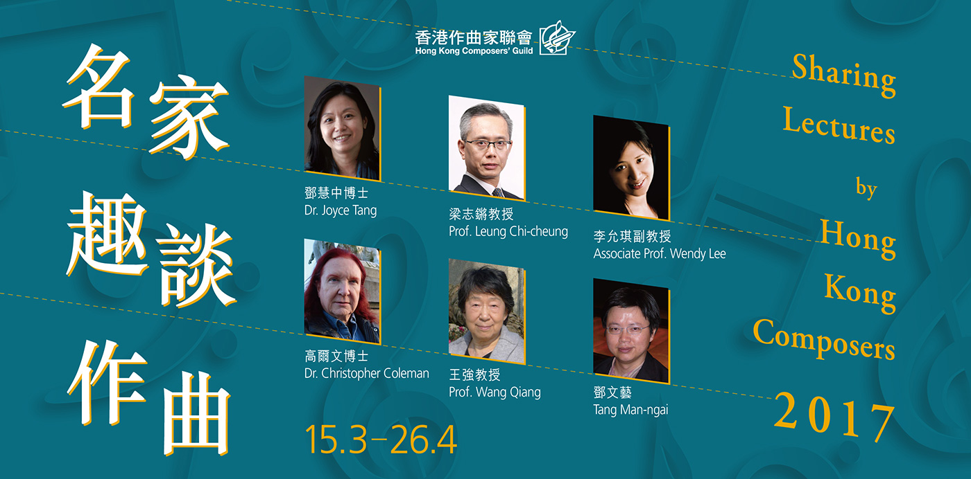 「名家趣談作曲2017」講座系列邀請來自香港作曲家聯會的六位優秀作曲家分享創作經驗及心得,部分講座更有示範演出。門票現於城巿售票網發售,節目詳情: https://goo.gl/ZRYpYN