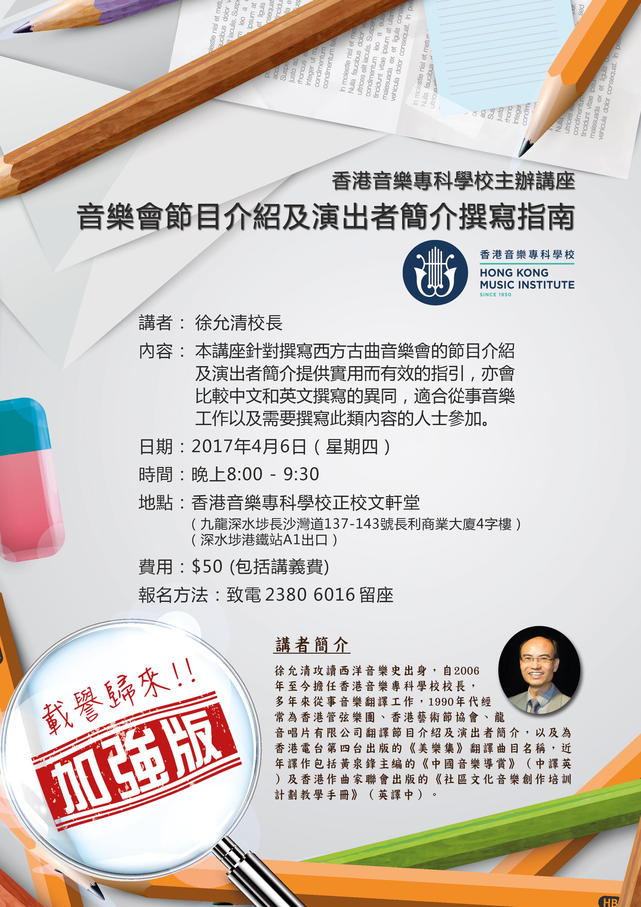由於上次講座報名情況非常踴躍,不少參加者反映坊間甚少此類講座,因此本校將於4月6日晚上8:00加開一場「音樂會節目介紹及演出者簡介撰寫指南」(加強版!!)。名額有限,欲報從速!!