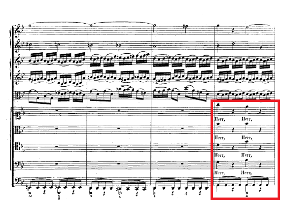 今年的受難節和復活節,筆者將會於參與巴赫《聖約翰受難曲》的演出。或者讓筆者介紹下這個樂曲的一些特色。在樂曲的一開始,巴哈就用了許多不協和的音程來預示受難的開始,特別是雙簧管與長笛部有許多令人窒息的兩度音程﹝圖四﹞。樂團的開端過後就是合唱團唱出「Herr」﹝Lord﹞﹝圖五﹞,來預示受難的會是上主耶穌。