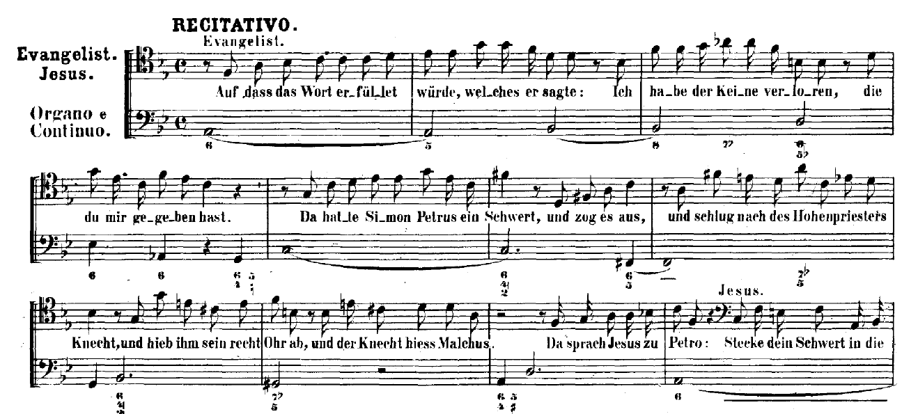 而第一個合唱完結後,巴赫就用幾個宣敘調和合唱來說明耶穌被捉走的經過。雖然宣敘調是用來交代故事發展,但也不代表是沉悶或枯燥的。如果大家之前有看過我關於和弦特性﹝特別是減七和弦﹞的文章:邪惡的減七和弦,就會理解到當中的奧妙。例如在宣敘調No.2a中,巴赫用了一個邪惡的減七和弦在背叛耶穌的猶大﹝Judas﹞上﹝圖六﹞。除了和弦之外,巴赫也利用快速節奏和急速的音區轉換來凝造緊張的氣氛。特別是在宣敘調No.4中,彼得切去大祭司耳朵的一節﹝圖七﹞。在某幾個詠嘆調中,巴赫也有使用到不同的特色樂器去表現不同的情感。例如彼拉多捉走和鞭打耶穌後的宣敘調No.19和詠嘆調No.20的雙柔音提琴,以及耶穌被釘十字架臨斷氣之前的詠嘆調No.30裡的古提琴獨奏。不知道大家又會對巴赫這些樂器的選材會否有共鳴和感覺呢?