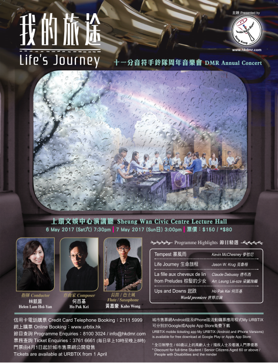 此外,由本手鈴隊舉辦的「手鈴作曲實驗室2016-2017」有幸邀請本地作曲家何百基先生特別創作全新樂曲,在音樂會中世界首演。我們希望透過演奏各種風格的樂曲,引領聽眾一起細味我的旅途。