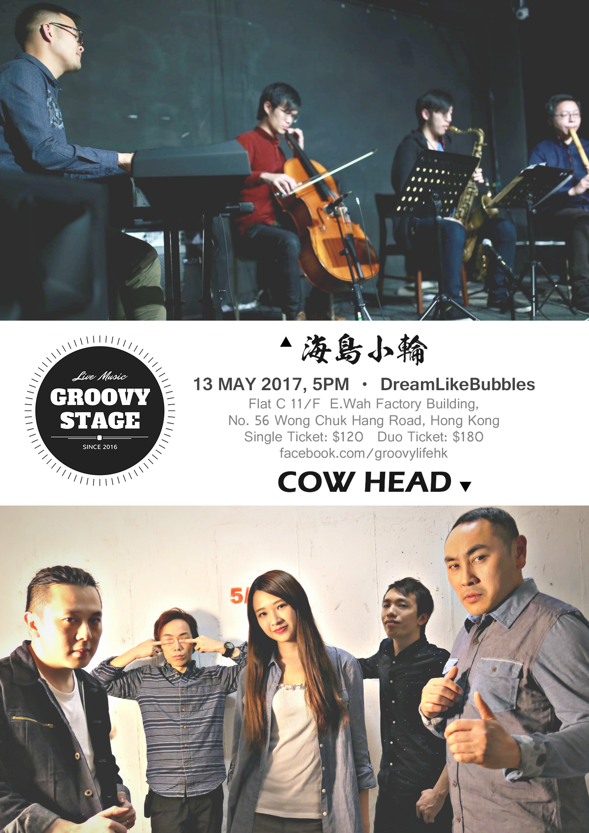 COW HEAD formed in 2014 and they are the 2nd Runner Up of Band Legend Competition 2016. They play acoustic instrument music instead of singing inlyricsthatbring audience to a different music experience. The group members: Guitarist Simon, Guitarist Ryan, Violinist & Keyboardist Mag, Bassist Chris and Percussionist YC.