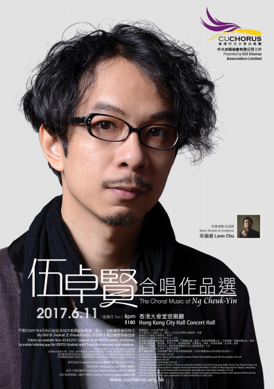 《伍卓賢合唱作品選》⾳樂會 中⼤合唱協會有限公司主辦《伍卓賢合唱作品選》⾳樂會將於2017年6⽉11⽇(星期⽇)晚上⼋時舉⾏,⾹ 港中⽂⼤學合唱團將在⾳樂總監朱振威指揮下演出全場伍卓賢作品。