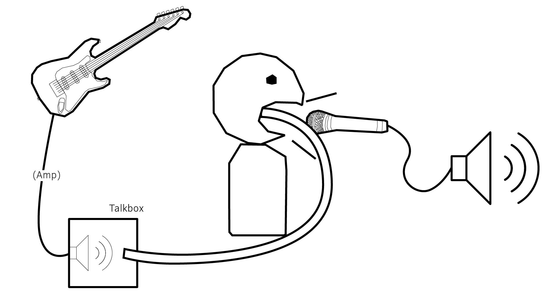 Talkbox的目的是,將聲帶的聲音變成樂器聲。Talkbox是一個盒子,內裡是一個喇叭,盒連著膠管。膠管將樂器的聲音傳到演奏者的口中,代替聲帶發聲,口腔將Talkbox的聲音改變,變成說話,就會做到Talkbox效果。