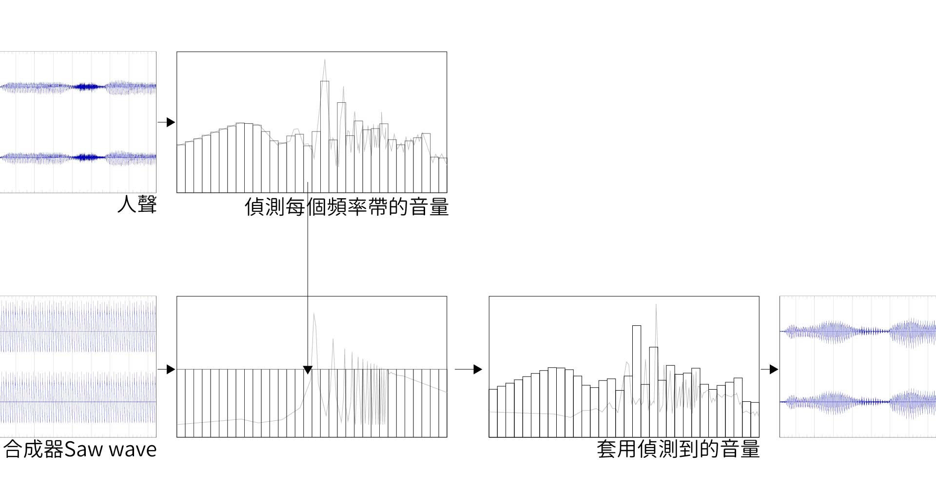 Vocoder會將一個聲音的頻譜變化,套用到另一個聲音之上。被改變的叫Carrier,控制別人的聲音叫Modulator。最常見的例子就是將人聲套用到合成器的Saw wave上。Vocoder首先會將兩個要混合的聲音,分成多個頻率帶,然後偵測Modulator每個頻率帶的音量變化,最後將偵測的結果偵測套用到Carrier上。