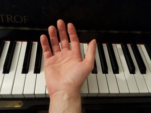 去幫助學生這個位置,溫柔地把學生的手打開 (經常要得到同意才接觸學生的手部),使他們感受到手部被動地打開是怎樣。另一方法,就是讓他們主動打開及伸展手指,亦讓他們被動地打開。以我男性的手部,這大約是六度或七度的音程,取決於當天我身體的感覺。(見上圖)