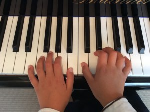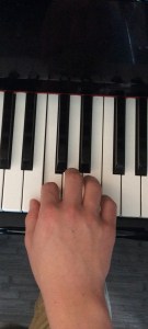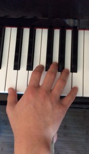 我發現有效解決這問題,就是告訴學生在練習時把眼關上,把手帶上鍵盤上,大部份學生對於手部只能覆蓋幾個白鍵,都感到驚訝。(見下圖)