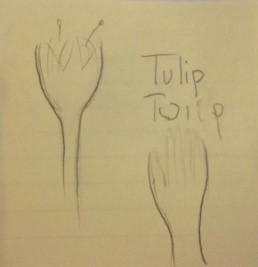 另一對齊齊整整的問題就是要把手腕伸直。當我們把手懸垂在身旁兩則,兩邊的手都不是完全伸直,或者向任何方向對著 (猶如內八字或外八字腳)。沒有一隻手指跟前臂連成一直線,我經常便用鬱金香和鬱金香的莖來形這關係。(感謝 Teresa Dybyig 提供圖像和Lauren Sonder 提供鬱金香的繪圖! ) (見下圖)