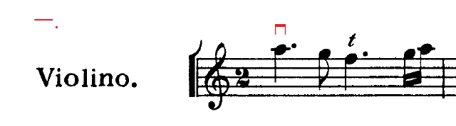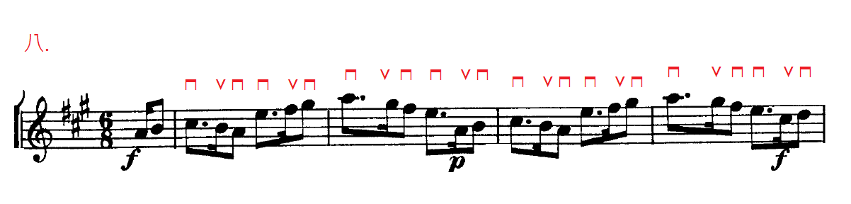 八.在複拍子的情況下,如三個組成的一拍,而第一個音是有符點的話,第一個音普遍是用下弓奏出。