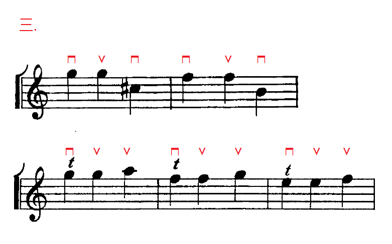 三.在三拍子時,有三個音符佔據了整個小節的話,慢的音樂時就要每個小節也要下弓=> 上弓 =>下弓奏出;而快的音樂時就要下弓=> 上弓=>上弓奏出。
