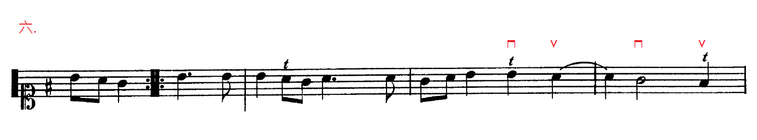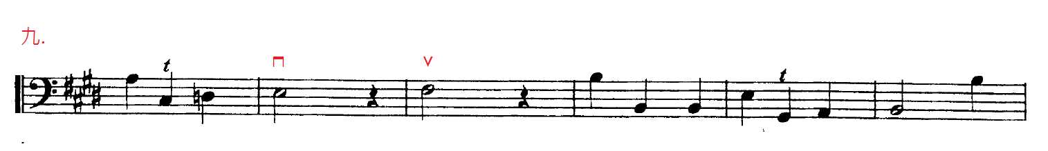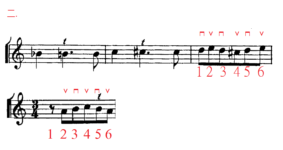 七.一連串小時值音符出現在時值較長的音符後,會跟第二點一樣:單數用下弓;雙數用上弓。如果情況需要,最後一個長音和第一個短的音符都是用下弓。