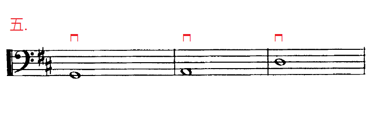 四.在複拍子﹝例如6/8,9/8 或12/8﹞的情況下,每一個大拍的第一音也是要用下弓奏出。
