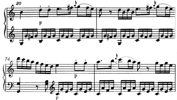 由感覺清澈的 C Major 轉到調號有一個 # 的 G Major,你可以感受到歌曲色彩有所轉變。另外,由於 1st subject 嚴格而言在 Bar 16 第 2 拍已經完結,Bar 16-19 小節其實為調性不穩的過渡 (bridge),之後醞釀出 Bar 20 煥然一新的 G Major 第二主題,彈奏時請細心留意過程中的音色變化。