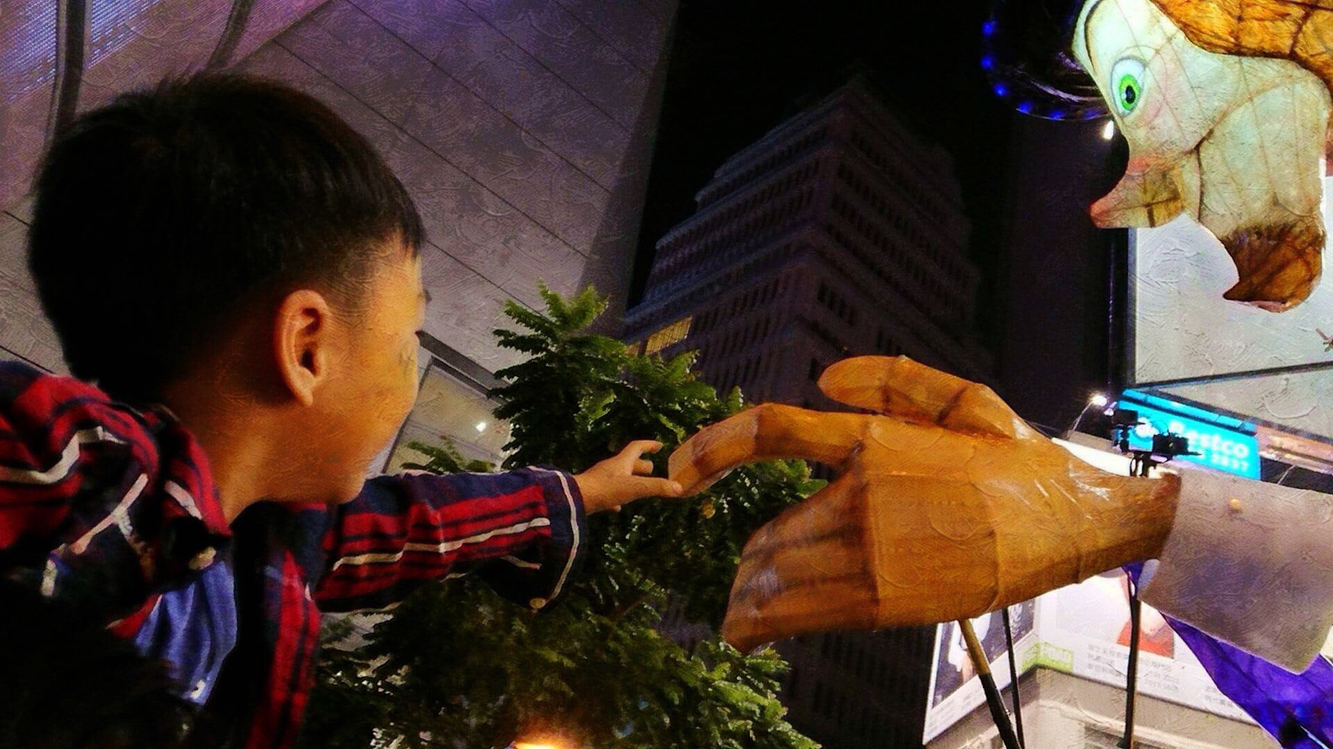 坐在爸爸的肩上,望得又高又遠,加上能與木偶及表演的人近距離接觸,他樂透了。