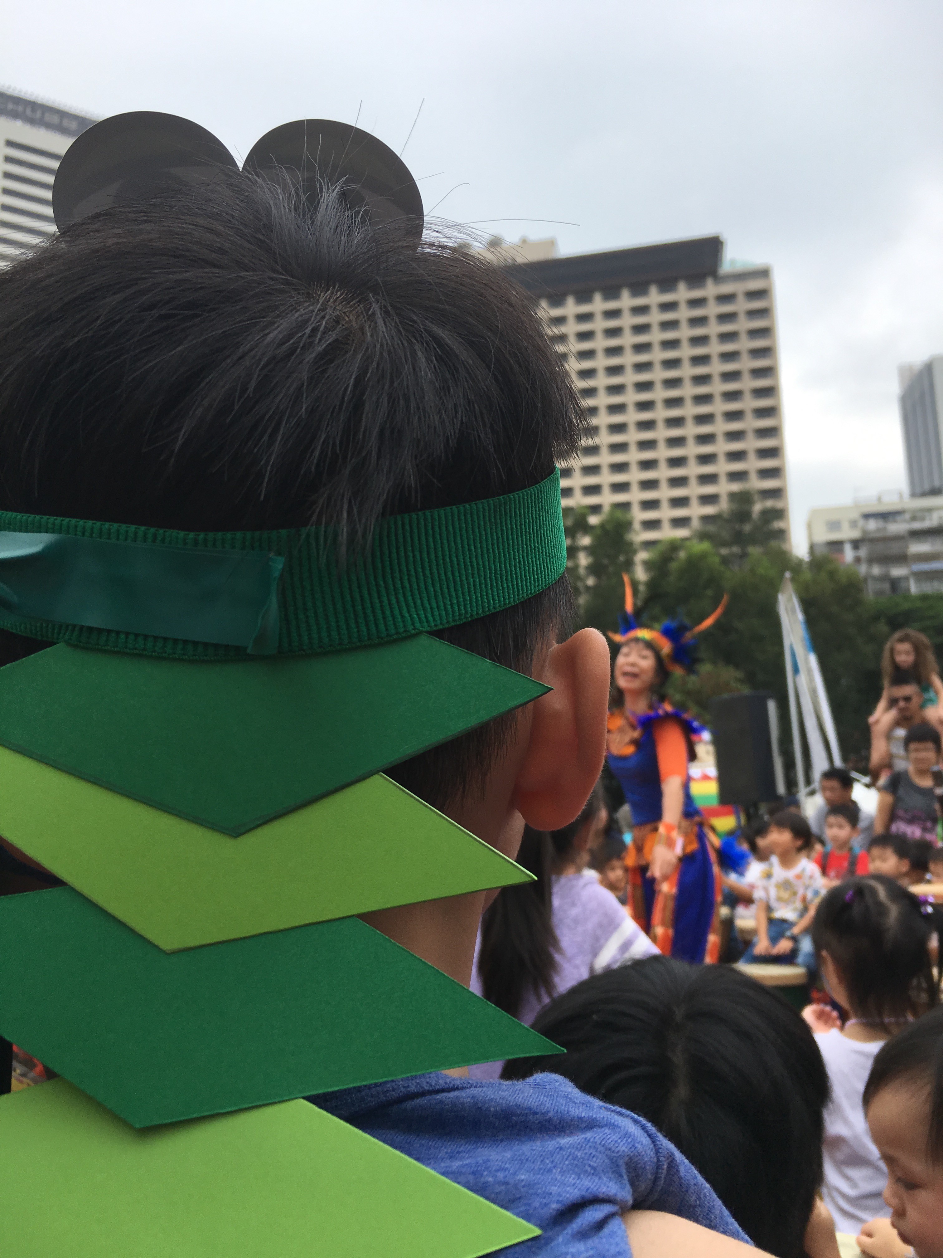 認識兒子的人都知道他是較安靜的男生,沒想到昨天鼓聲雷動時,他竟然沒有說嘈吵,還拉著我要「一玩再玩」。因參與人數眾多,第一節開始時,他只可以在台上的後排觀賞。約廿分鐘後,他發現有小朋友提早離場,便拉著我去那個鼓的位置,加入打鼓的行列。帶領者與跟隨者有很強的互動,加上有趣的遊戲,台上台下打成一片,十分熱鬧。