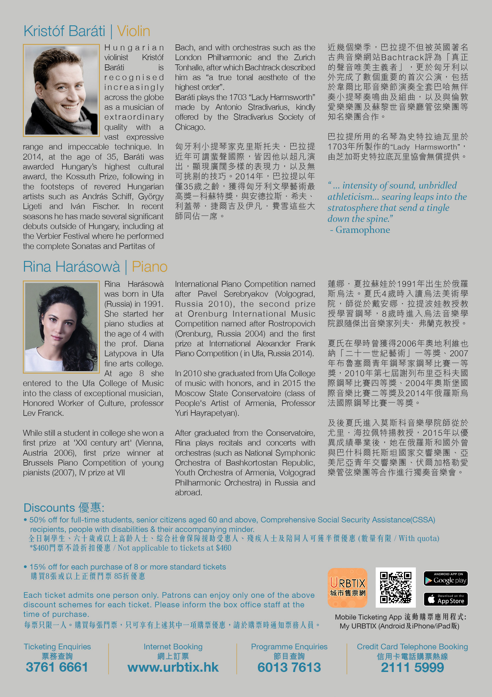 匈牙利小提琴家基斯托夫.巴拉提(Kristóf Baráti)近年可謂蜚聲國際,皆因他以超凡演出,顯現他廣闊多樣的表現力,以及無可挑剔的技巧。2014年,巴拉提以年僅35歲之齡,獲得匈牙利文學藝術最高獎-科蘇特獎(the Kossuth Prize),與安德拉斯.希夫(András Schiff)、利蓋蒂.捷爾吉(György Ligeti)及伊凡.費雪(Iván Fischer)這些大師同佔一席。