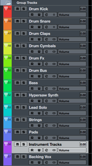 (為每條音軌起一個專屬的名字,並用上不同顏色,類同的樂器,如Drum Kick/Snare,就用上相同的顏色,方便於編曲/混音時作出微調。)