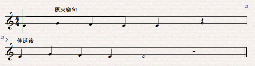 把原來樂句的節奏伸延,在正統的樂理上,這種伸延是剛剛好把樂句每一個音的長度拉長一倍,音符不變,也就是玩慢一倍,如下圖。