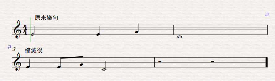 和剛才的伸延相反,把每粒音符的節奏剛好縮一半,也就是玩快一倍,如下圖