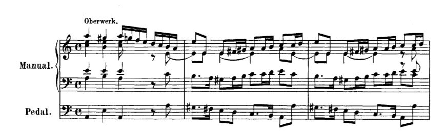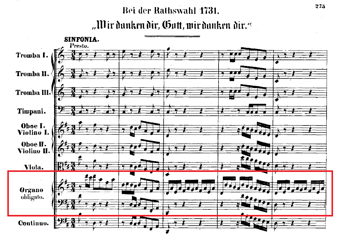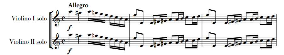 在第四個例子裡,巴哈甚至是循環其他作曲家的作品,其實即是抄襲⋯BWV 592至597一系列的Organ Concerto全部也是改編其他作曲家的作品。當中BWV 593〔圖八〕就是改編自Vivaldi的Concerto for 2 Violins in A Minor, RV 522〔圖九〕