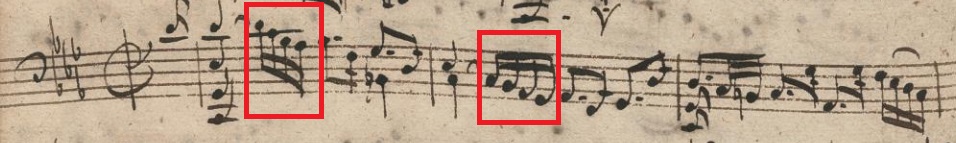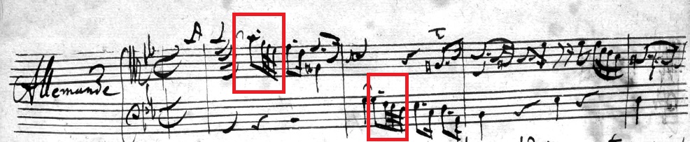 第一個例子是Cello Solo Suite No.5 BWV 1011和Lute Suite BWV 995。大家看一看Prelude和Allemande,就會見到〔圖一〕Cello版本及〔圖二〕Lute版本節奏的不同。有時巴洛克時期的作曲家不一定會將法國式Double Dotting的節奏標明得清楚。通過觀察不同的版本我們就可以當時的演奏方法有一點啟發。