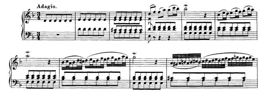 第五個例子雖然也是改編其他作曲家的作品,但巴哈也花了不小心機去令作品豐富起來。在16 Concertos by Various Maestros BWV 972-987中的BWV 974是改編了Marcello的Oboe Concerto in D Minor。在第二樂章之中〔圖十〕,巴哈為Marcello簡單的旋律〔圖十一〕添加了很多裝飾。這個例子能夠令我們更加明白巴哈怎樣以簡單旋律為基礎,發展成滿佈裝飾的樂句。這個例子也令我們知道巴洛克時期的加花,可以加得有幾恐怖…
