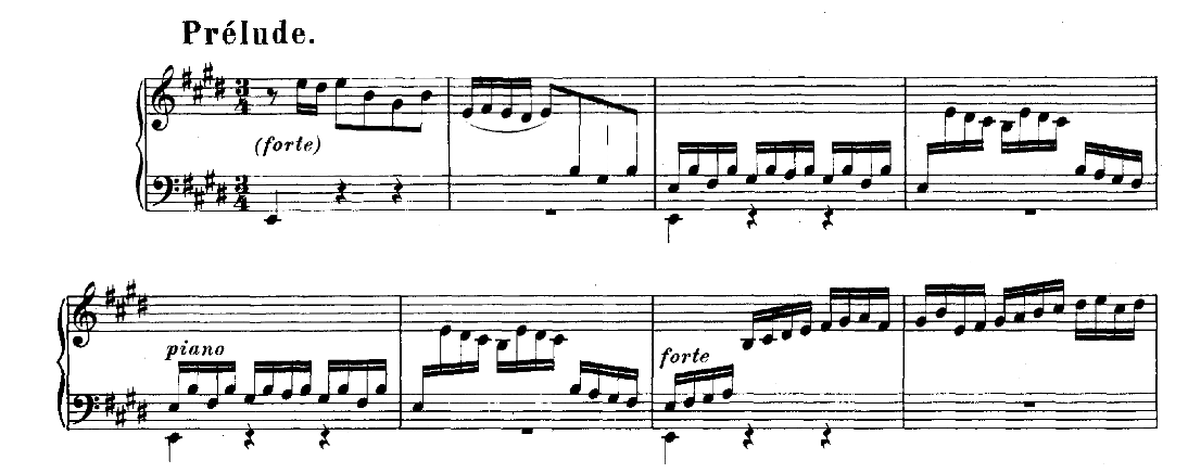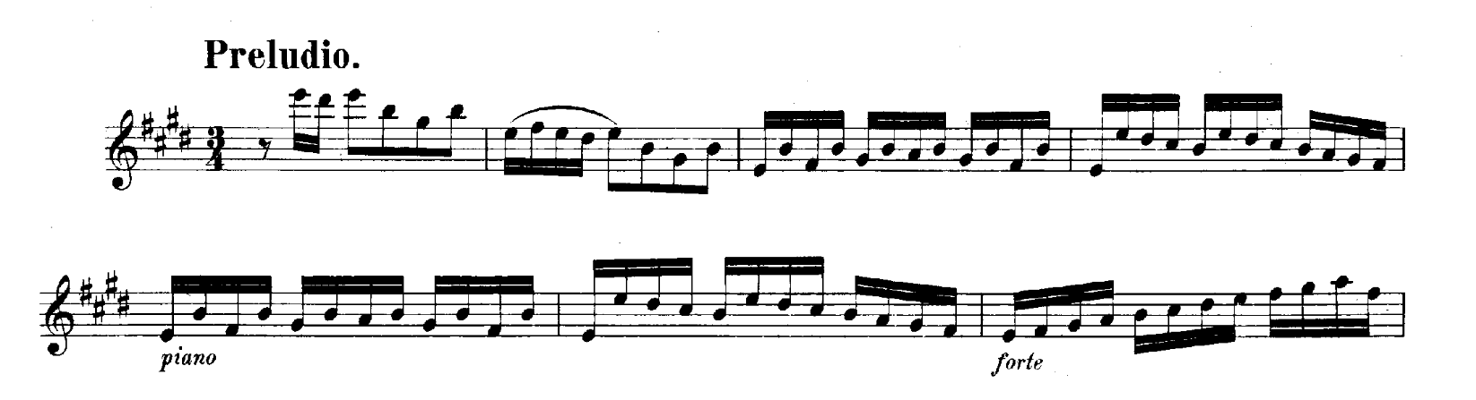 第三個例子是Violin Solo Partita No.3 BWV 1006和Lute Suite BWV 1006a。而它們的Prelude更被改編到Cantata BWV 29的Sinfonia和Cantata BWV 12a Second Part的Sinfonia。也許從小提琴〔圖五〕和Lute〔圖六〕的版本沒有太大的分別和驚喜,但在兩首Cantata的Sinfonia就不同〔圖七〕。巴哈通過加上不同的樂器﹝特別是小號﹞在歌曲中得到澎湃和興奮的音色。如果你是演奏小提琴或是Lute的版本,你會有一點音色上的啟發嗎?