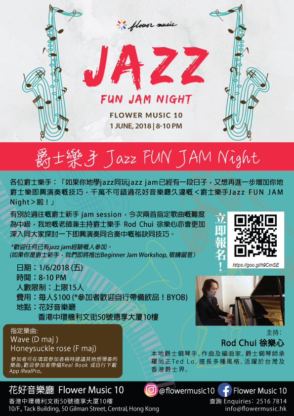 各位爵士樂手:「如果你地剛剛開始學jazz又或是已經學了有一段日子,又想再進一步增加你地爵士樂即興演奏嘅技巧,千萬不可錯過花好音樂廳久違嘅<爵士樂手Jazz FUN JAM Night>啦!」