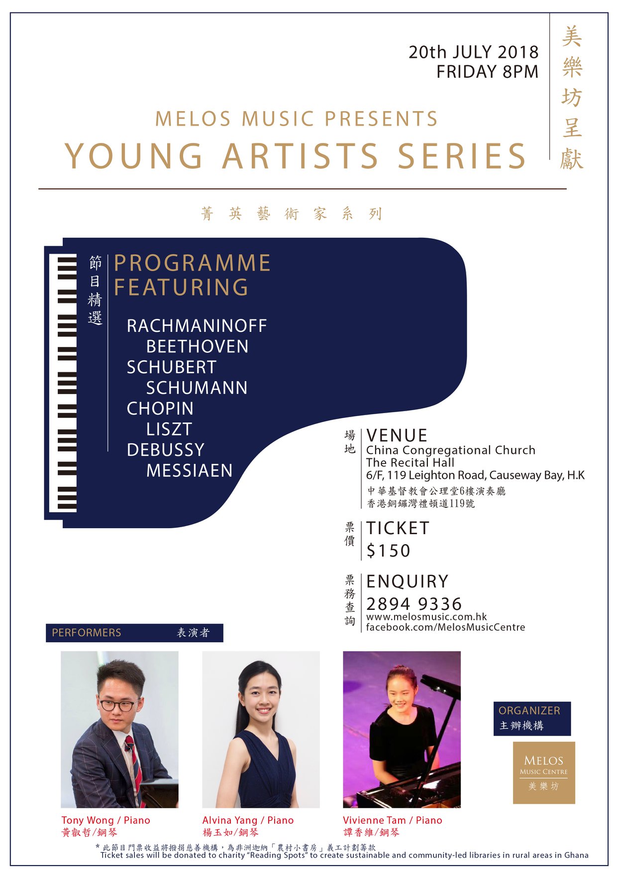 三位年青藝術家: 黃叡哲(Tony Wong), 楊玉如(Alvina Yang)及譚香維(Vivienne Tam)演奏多首鋼琴作品, 並將門票收益撥捐慈善機構,為非洲迦納「農村小書房」義工計劃籌款!