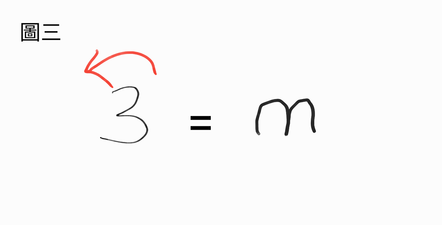 3:將3字推倒,便是m了。(請參考圖三)