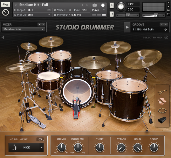 當然,做一條像真度的鼓track,必需要一個質素甚高的drum sample吧。個人首推Toontrack Superior Drummer 3,筆者是Version 2的用家,不過新版重新採樣,Engine也是重新設計,像真度亦與其價格成正比的,盛惠400美元。想便宜一點呢,可以考慮FXpansion BFD3、Addictive Drums、Toontrack EZDrummer等drum sample。當然,筆者建議讀者自己去聆聽一下demo,甚至下載試用一下。畢竟每一套鼓只適合某些類型的音樂,故此請讀者投其所好吧。而筆者則是Native Instruments Studio Drummer的用家,所以以下的demo都是用這套軟件來做的。