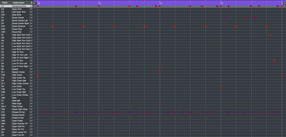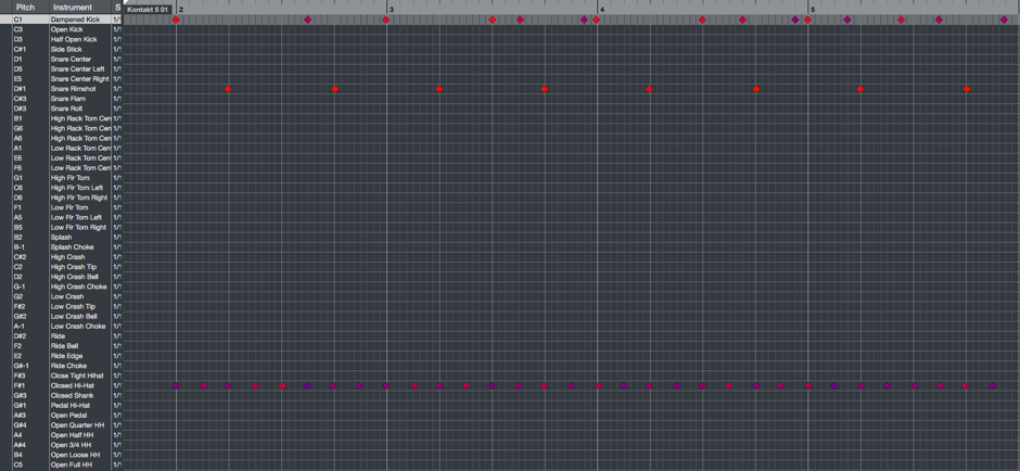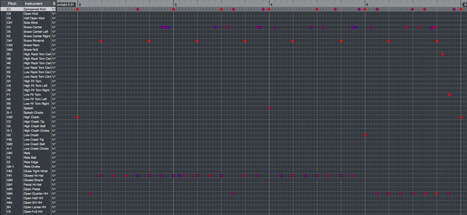 一套爵士鼓由不同鼓件組件組成:Kick、Snare、Hi-hat、Rack Toms、Floor Toms、Cymbals等。當挑選好使用哪一套drum sample時,第一件事就是熟悉一下那套drum sample的drum map。每一個鼓件最少用一個MIDI note去trigger的,譬如在Studio Drummer裹,C1是用來trigger kick drum的。亦由於drum sample做得愈來愈仔細,有些鼓件正因為有其他不同的打法(例如打snare drum可以是普通的snare hit、side stick、rim shot、snare flam等不同打法),通常每一種打法均會用指定的MIDI note去trigger。故此筆者建議讀者先花時間去熟讀一下drum map。