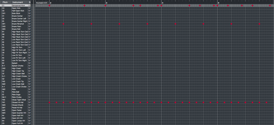 研究好drum map,就先砌一個簡單的4-bar drum pattern吧!由於筆者懶與手殘的緣故,故此不會Keyboard錄,用mouse打譜算了!Kick在第一、三拍,Snare在第二、四拍,Hi-hat打八分音符。中間會有些少變化。