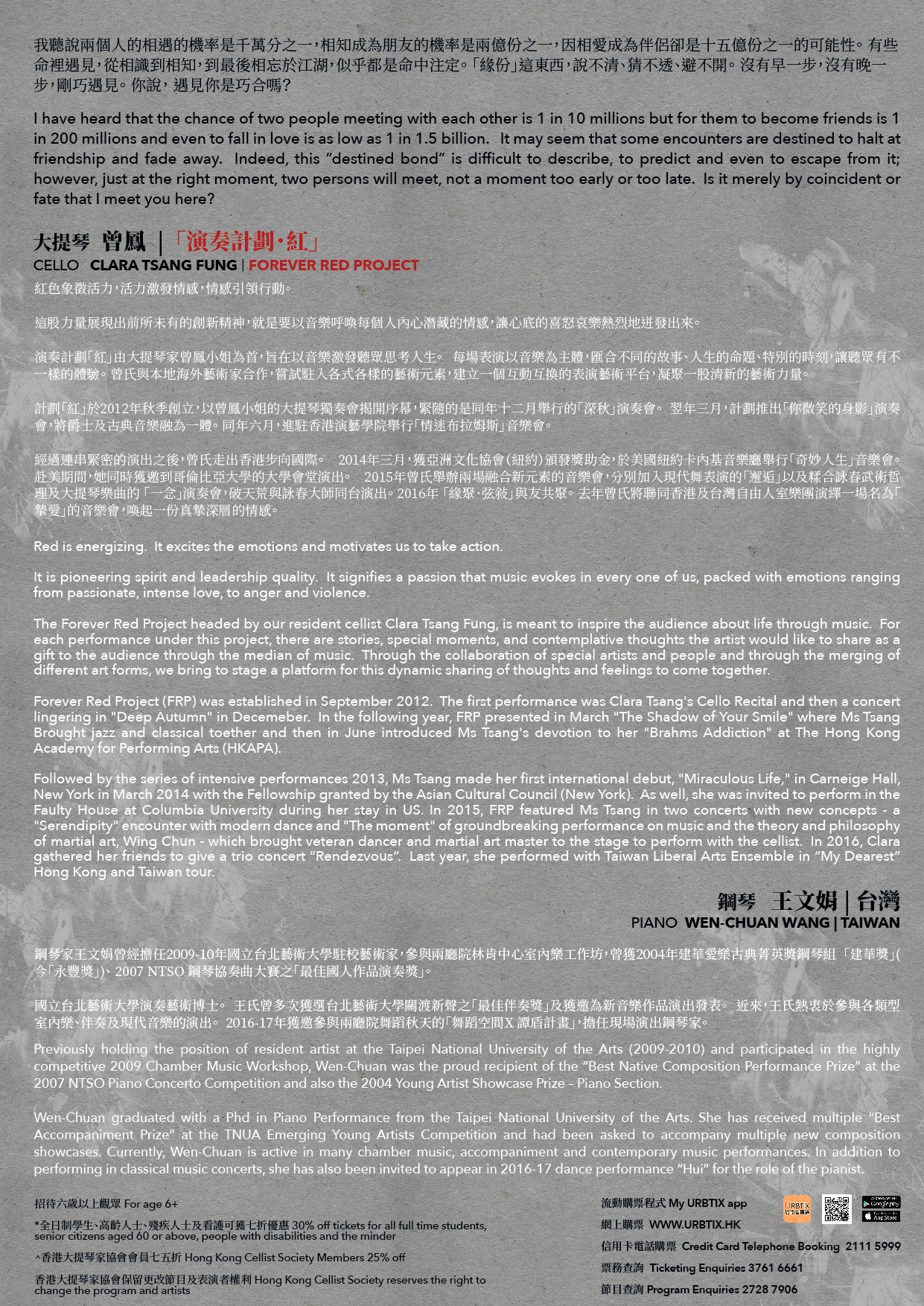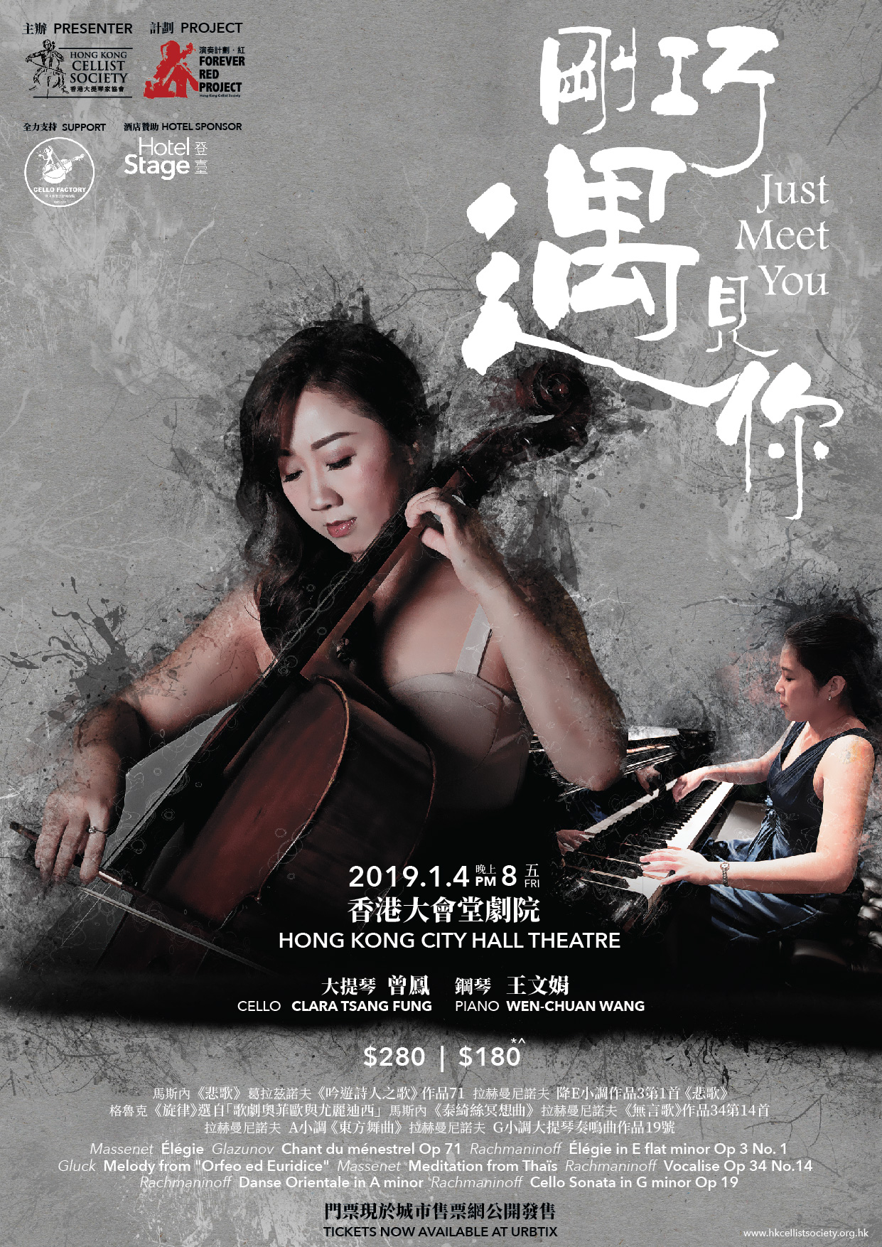 香港大提琴家協會將於2019年1月4日, 星期五晚上8時香港大會堂劇院舉行一場緣份式的演奏會《剛巧遇見你》(JUST MEET YOUR),由香港大提琴家曾鳳聯同台灣鋼琴家王文娟攜手演出。有綠相會!
