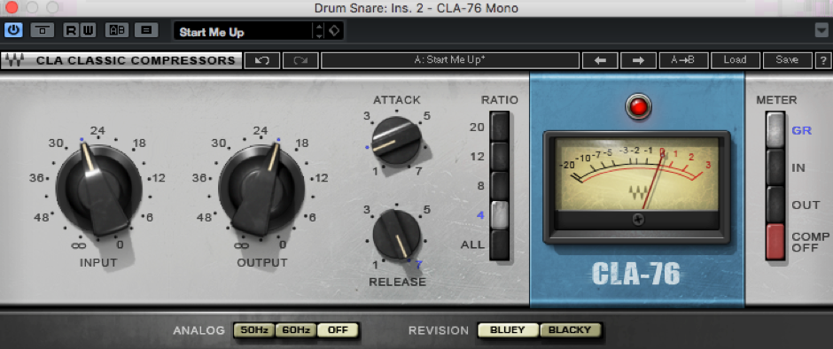 Compression方面,太快的attack time會帶走太多的transient,故此會用上較長的attack time,而用上較長的Release time則增加snare的sustain。若果snare比較多ghost notes的話,可以考慮使用較多的gain reduction,那麼ghost notes會明顯得多。