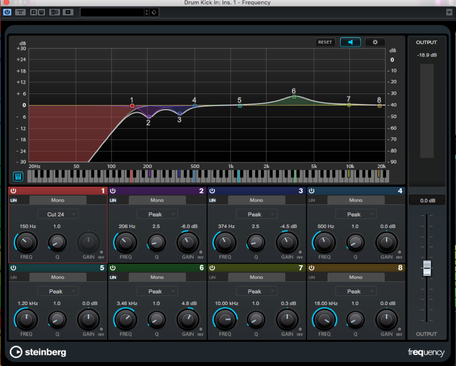 同樣地,也可在kick in的那條track放一個compressor,將attack time調至中或慢,而release time則比較快,好讓足夠的attack通過compressor,然後再壓縮。由於低頻的主要來源是kick out,讀者大可以用EQ把多餘的低頻砍掉。若果想beater聲明顯一點,可以用EQ將2.5-4KHz的音量調高一點。