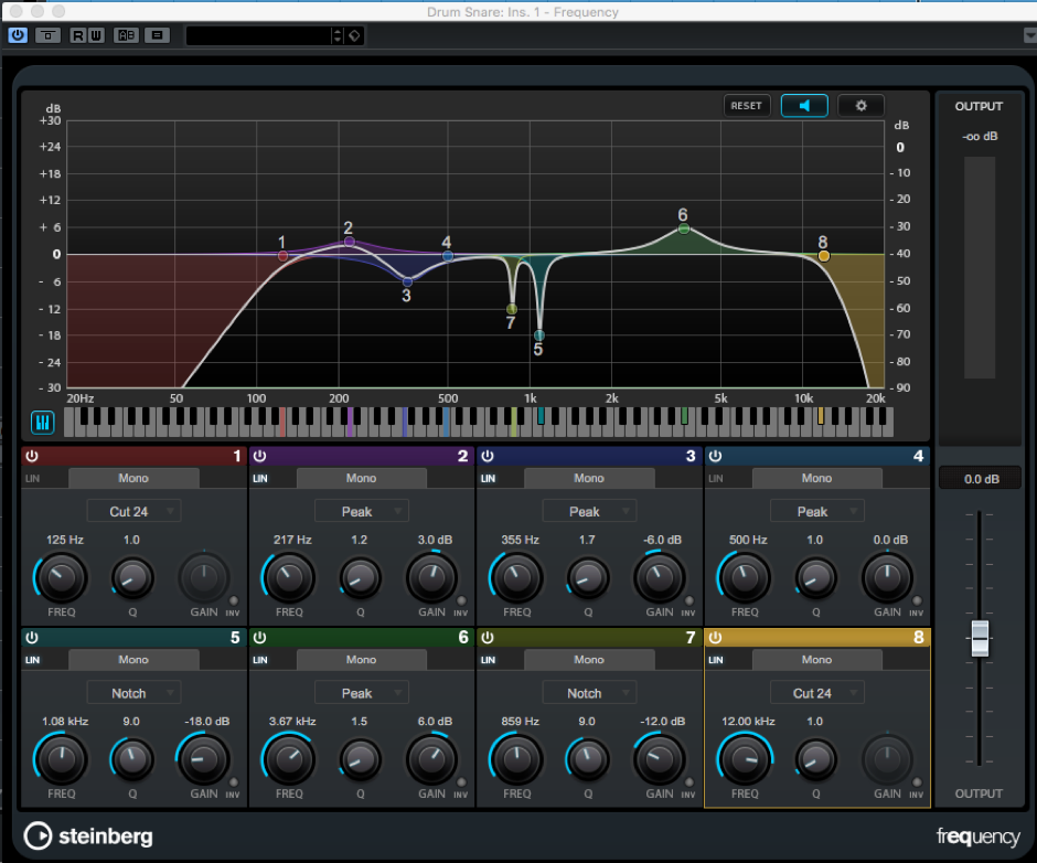 EQ方面,筆者通常會用high-pass filter將多餘的低頻去掉。150-250Hz是snare的body,把其調高會增加snare的厚度。過多的350-500Hz會令snare聽起來比較模糊,些少的衰減令snare更清晰。1.5-4.5KHz是snare attack,調高可令attack更明顯。另外,要多留意snare的ringing,一般在700-1000Hz的位置。筆者會用一個十分大Q值的notch EQ去尋找這些ringing的frequency,然後砍掉(如下圖,Point 5及7)。這樣聽起來,snare變得乾淨很多。