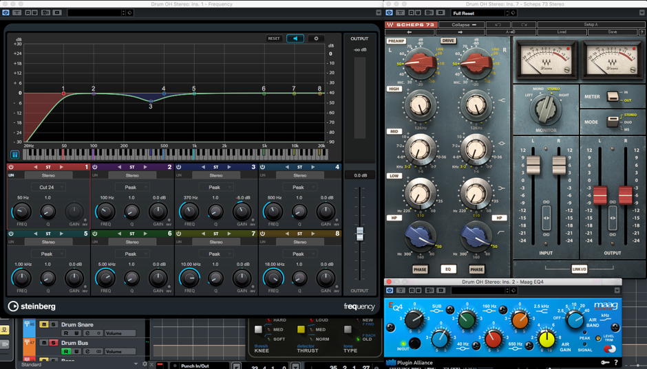 由於整套鼓的音色大部份取決於overhead mic,故此筆者亦較喜歡利用compressor自身對音色的coloration來塑造鼓組的音色。例如用Neve 2254(Waves V-comp是模擬這台古舊的compressor)來增加樂器和暖感,VCA compressor如SSL G-comp/API 2500則令樂器聽起來更有力,但比較少音染,Urei 1176 FET compressor不但令樂器更有力,它的音染令聽者聽起來更加dirty sound。