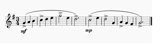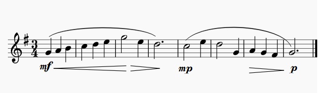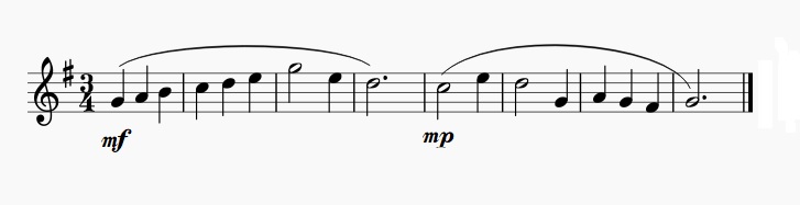 舉個簡單的例子,這首樂曲以4小節為一句,當我們找出樂句後,可以試著唱出來,這樣更容易感受到樂句,另外,要學會觀察旋律的走動,例如這首樂曲是以mf開始,但其實並不代表這一整句都是用mf來彈,音量是要根據音樂的走動而做出變化,例如第一句的音樂是由低往高,做漸強可以使音樂更有張力,到第3和第4小節,音樂由上往下,樂句也快要結束了,因此要稍微漸弱, 到了第5小節,音樂是從mp開始,整體音量要比前一句弱,到了第7小節,樂曲接近尾聲了,做漸弱可以使音樂寧靜地結束。